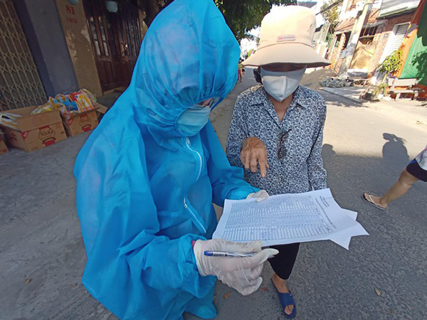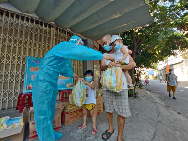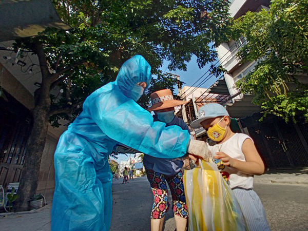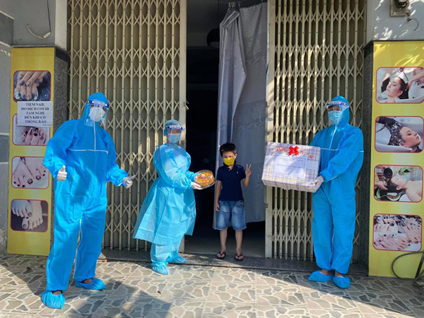 Có trường hợp đặc biệt là bé H.K.N sinh năm 2014 (ở khu vực An Cư 3, phường An Hải Đông, Sơn Trà, nhà cũng thuộc diện đang phong tỏa). Nhà em có 3 người, em là F0, sau 4 lần xét nghiệm âm tính đã được đưa về tiếp tục cách ly tại nhà. Ba em là F1 và mẹ là F0 đang điều trị, cách ly. Cậu bé 7 tuổi giờ không có người thân bên cạnh. Nhận quà 1/6, bé K.N giơ hai ngón tay ký hiệu chiến thắng, với lời bày tỏ “Ba mẹ và gia đình cứ yên tâm điều trị và cách ly nhé!” - Ảnh: Trung Trương |
