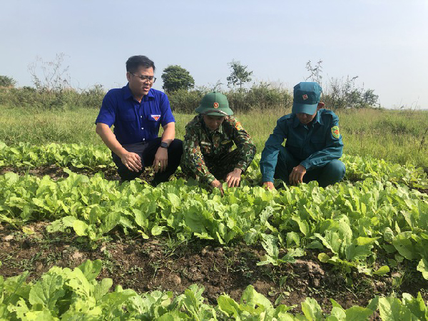 Anh Phan Duy Bằng, Phó Bí thư Tỉnh Đoàn An Giang (áo xanh thanh niên) trò chuyện với các chiến sĩ. |