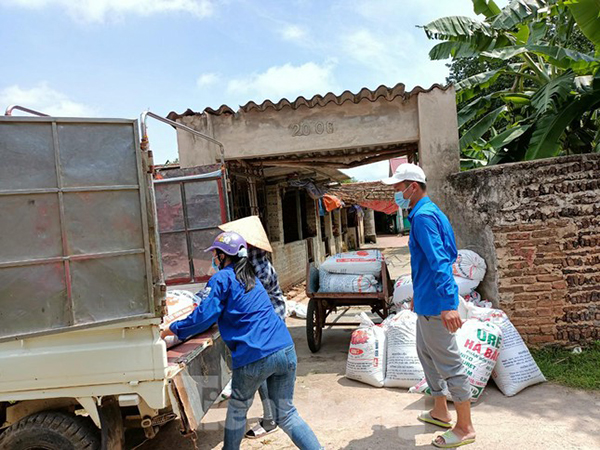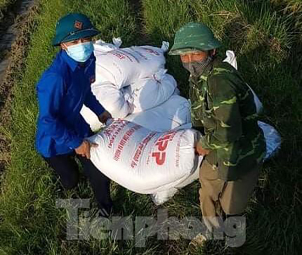 Ngoài trời nắng như đổ lửa, Nguyễn Thị Duyên – Bí thư Đoàn xã Đông Lỗ, huyện Hiệp Hoà, sắn quần ngang gối, lội xuống ruộng lúa, rồi cùng một đoàn viên khác bê bao thóc lên xe máy để chở về cho những gia đình bị cách ly.