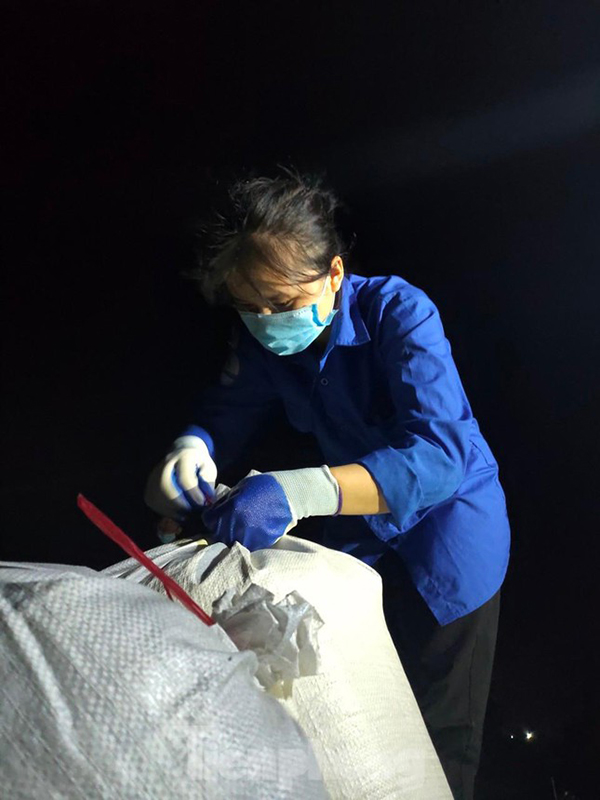 Một đoàn viên huyện Tân Yên buộc bao thóc thu hoạch trong đêm cho người dân bị cách ly. |