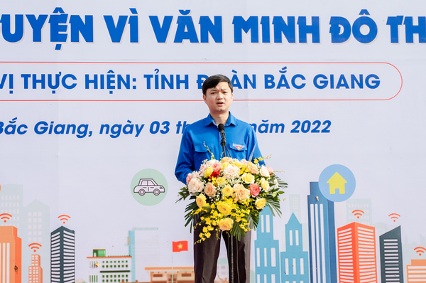 Bí thư Trung ương Đoàn Nguyễn Minh Triết phát biểu phát động Ngày cao điểm “Chiến sĩ tình nguyện vì văn minh đô thị” năm 2022