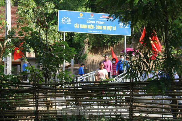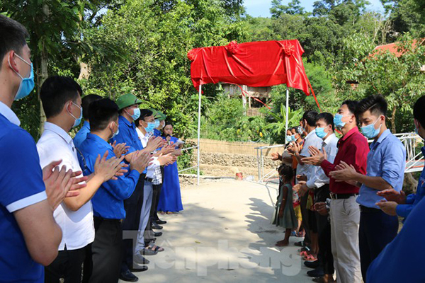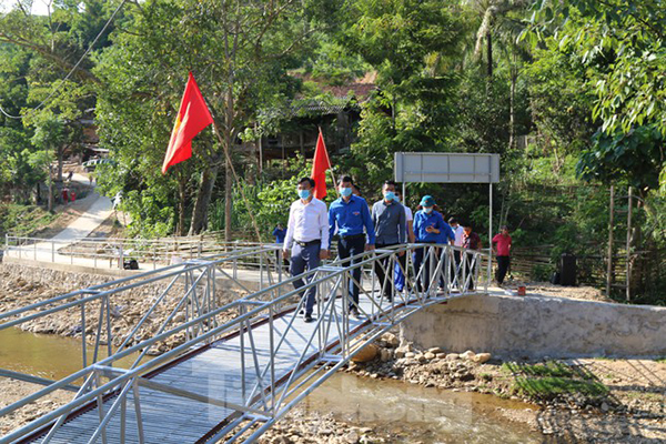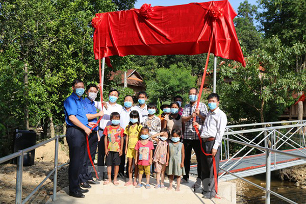 Đại biểu thực hiện nghi thức khánh thành đưa cây cầu vào sử dụng. Phục vụ giao thông đi lại của học sinh, người dân sở tại. |