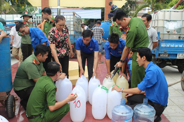 Đoàn thanh niên công an tỉnh chở hàng trăm khối nước về tận nơi hỗ trợ cho người dân bị hạn mặn. |