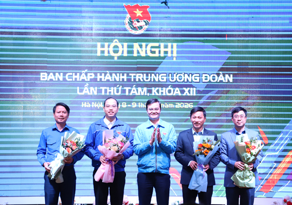 Anh Bùi Quang Huy, Ủy viên dự khuyết Trung ương Đảng, Bí thư thứ nhất Trung ương Đoàn tặng hoa chúc mừng các anh tham gia BTV Trung ương Đoàn khoá XII. |