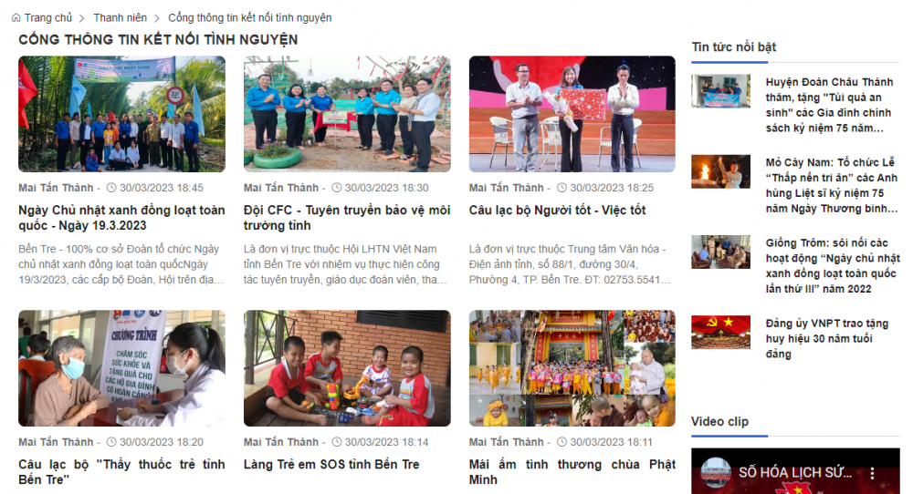 “Cổng thông tin kết nối tình nguyện” Tỉnh đoàn Bến Tre được tích hợp trên “Sổ tay điện tử cán bộ Đoàn” tỉnh Bến Tre với địa chỉ truy cập: https://sotaycanbodoanbentre.coquan.vn/ là địa chỉ đáng tin cậy để các bạn đoàn viên, thanh niên, tình nguyện viên và người dân tìm kiếm, kết nối các thông tin về hoạt động tình nguyện trên địa bàn tỉnh Bến Tre, đặc biệt là các chương trình, chiến dịch, dự án tình nguyện; là nơi kết nối các tổ chức, cá nhân quan tâm, yêu thích với các hoạt động tình nguyện, hoạt động xã hội trên địa bàn tỉnh, bao gồm các chuyên mục: Chiến dịch Thanh niên tình nguyện hè; chương trình, dự án tình nguyện; nhật ký tình nguyện; gương sáng tình nguyện; Câu lạc bộ, đội, nhóm tình nguyện; địa điểm tình nguyện; kỹ năng tình nguyện; quyên góp thực hiện hoạt động tình nguyện với nhiều hình ảnh trực quan, thông tin bổ ích giúp các bạn đoàn viên, thanh niên và người dân dễ dàng tiếp cận, trao đổi, kết nối thông tin về các hoạt động tình nguyện.