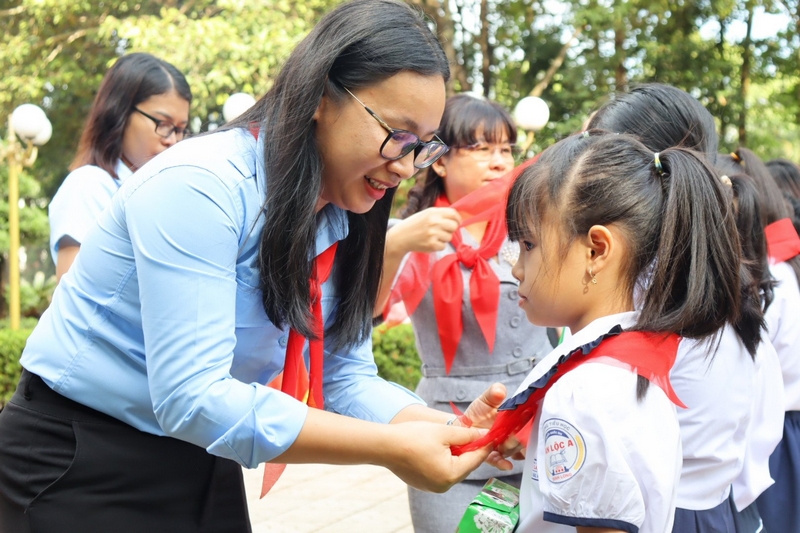 Chị Lê Thị Hồng Phấn, Phó Bí thư Tỉnh Đoàn, Chủ tịch Hội đồng Đội tỉnh trao khăn quàng cho đội viên mới kết nạp. |