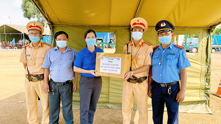 Bí thư huyện Đoàn Bù Đăng Đào Thị Quế (đứng thứ 3 trái qua phải) trao tặng nón chắn giọt bắn cho chốt phòng, chống dịch Covid-19 tuyến quốc lộ 14 đoạn giáp ranh với tỉnh Đắk Nông