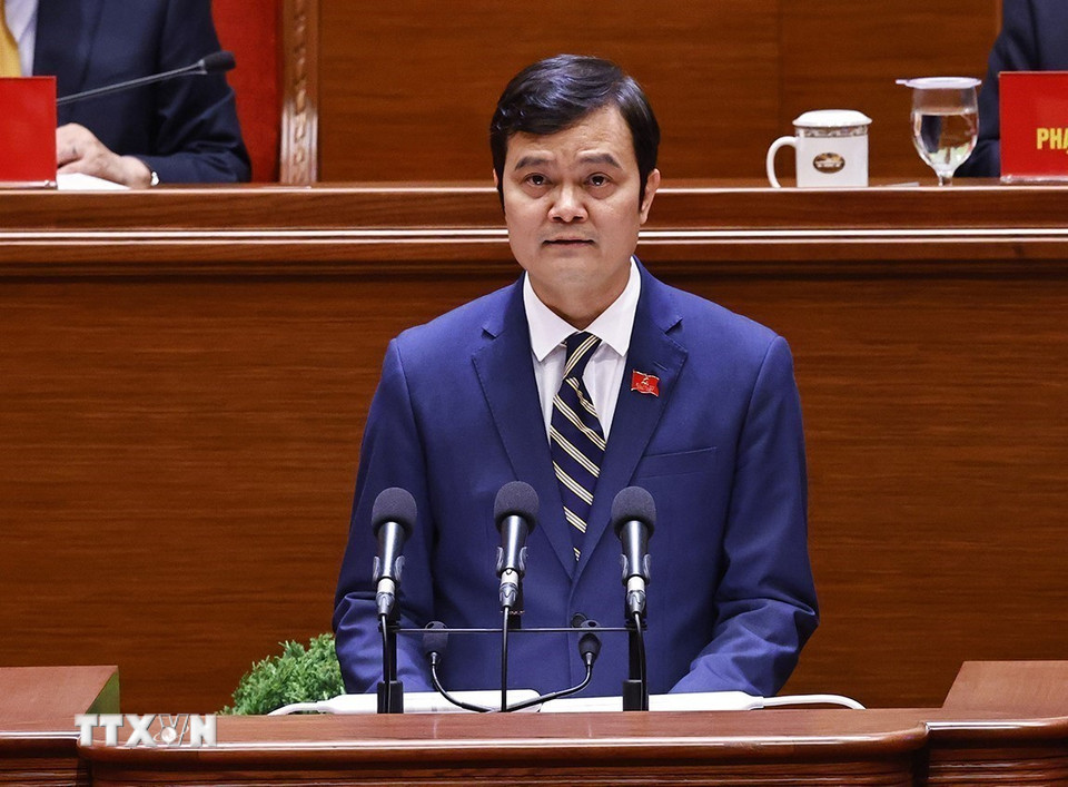 Đồng chí Bùi Quang Huy, Ủy viên dự khuyết Trung ương Đảng, Bí thư thứ nhất Trung ương Đoàn, Phó Chủ tịch Ủy ban Trung ương Mặt trận Tổ quốc Việt Nam tham luận tại Đại hội. Ảnh: TTXVN |