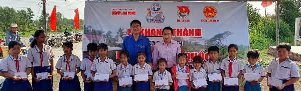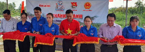 Đại diện lãnh đạo Tỉnh Đoàn, Báo Người Lao động và Đảng ủy xã Khánh Bình Tây cắt băng khánh thành công trình “Đường cờ Tổ quốc”. |