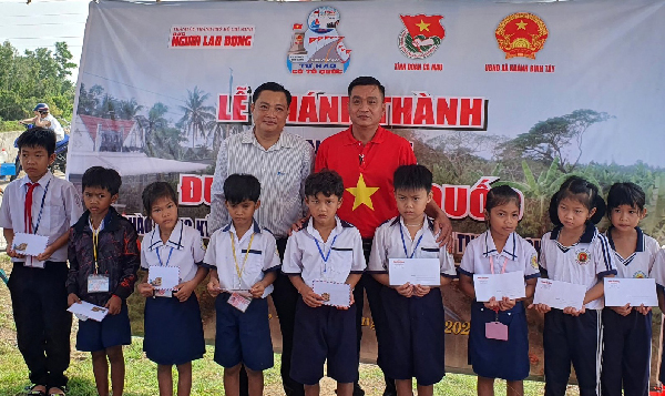 Anh Trần Đăng Khoa, Phó Bí thư Tỉnh Đoàn và Đại diện Đảng ủy xã trao học bổng cho học sinh. |