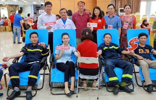 Đại úy Phạm Thanh Nam - Phó Đội trưởng Phòng Cảnh sát PCCC và CNCH, Công an tỉnh Nghệ An (bìa trái) tham gia hiến máu tình nguyện. |