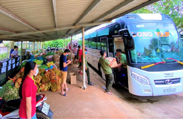 Nông sản từ thiện được Cty Long Vân chở bằng xe khách có máy lạnh. |