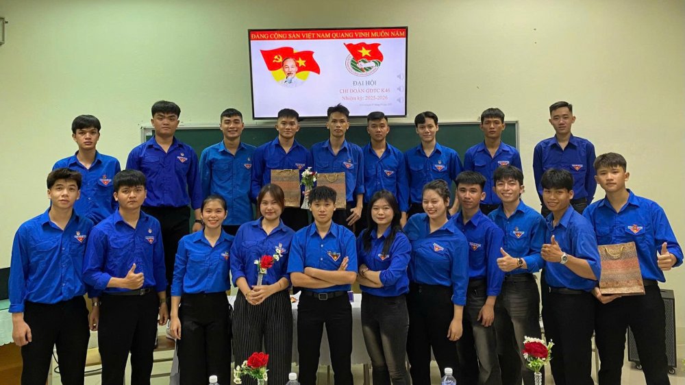 Trần Minh Hậu (hàng trước, thứ hai từ phải sang) cùng các thành viên lớp GDTC K46. |