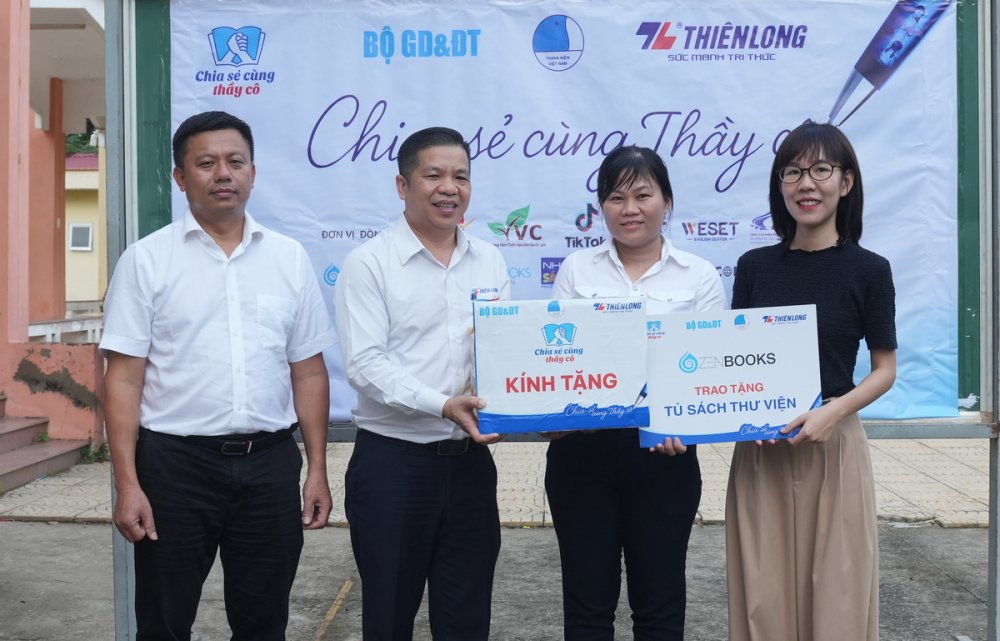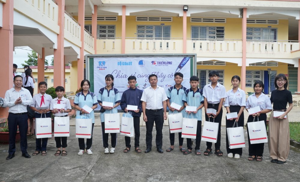 Trong hành trình đến với nơi đây, chương trình “Chia sẻ cùng thầy cô 2025” đã trao tặng nhiều phần quà ý nghĩa cho mỗi trường gồm: 20 suất học bổng do công ty IMC tài trợ, cho học sinh vượt khó; 200 cuốn sách từ nhà tài trợ Zenbook và SGbook; dụng cụ học tập và tủ sách thư viện “Triệu trái tim Việt viết vẽ lời tri ân” từ Tập đoàn Thiên Long.