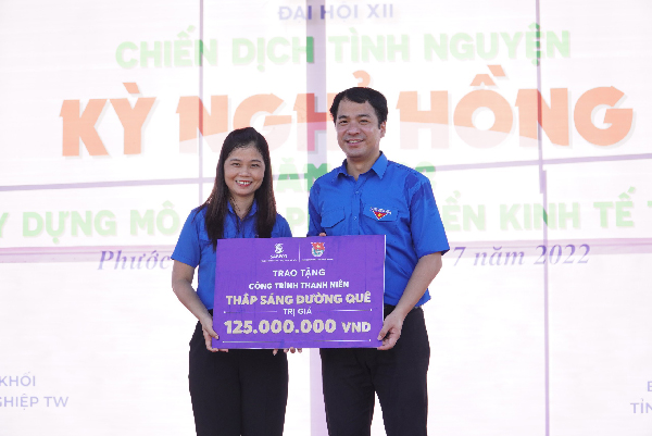 Anh Ngô Văn Cương, Bí thư Trung ương Đoàn trao biển tượng trưng hỗ trợ kinh phí công trình Thắp sáng đường quê. |