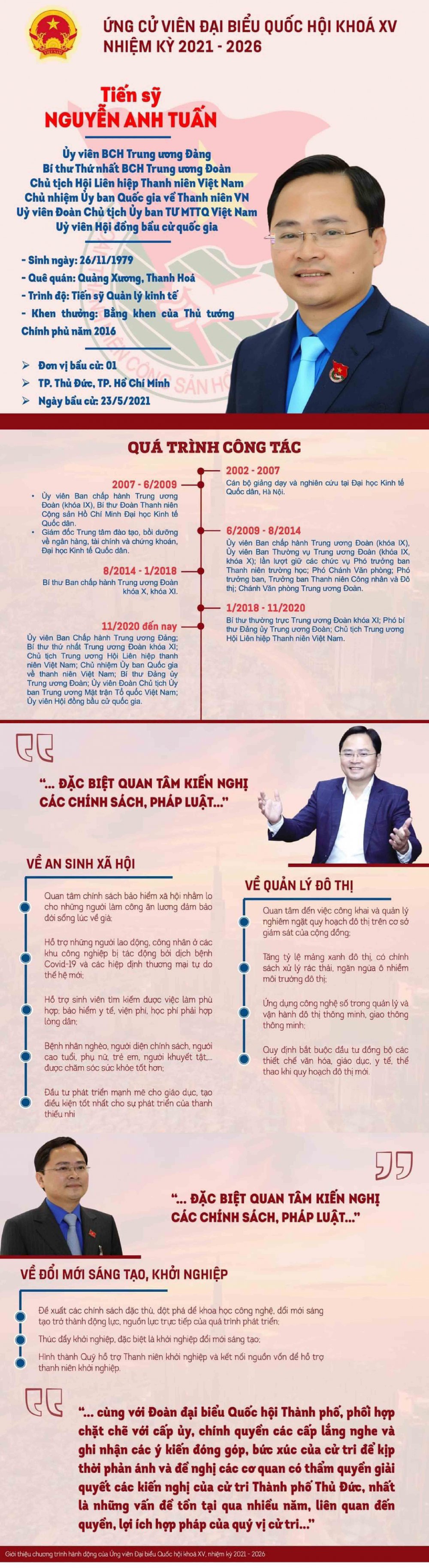 (CTG) Quan tâm kiến nghị các chính sách pháp luật; hỗ trợ những người lao động, công nhân các khu công nghiệp bị tác động bởi dịch COVID-19; hỗ trợ sinh viên tìm kiếm được việc làm phù hợp... Đó là một số nội dung đáng chú ý trong Chương trình hành động của ứng cử viên Đại biểu Quốc hội Nguyễn Anh Tuấn - Ủy viên T.Ư Đảng, Bí thư thứ nhất T.Ư Đoàn, Chủ tịch T.Ư Hội LHTN Việt Nam.
