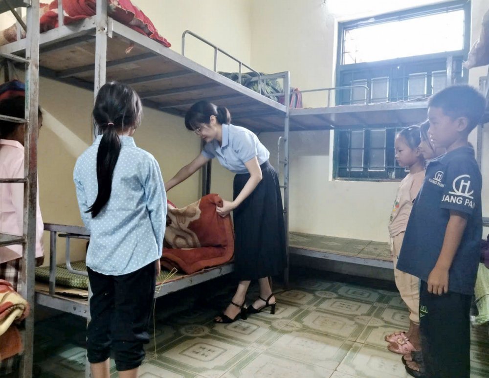 Cô Vương Thị Thúy Mơ hướng dẫn học sinh gấp chăn, dọn phòng trong khu nội trú. Ảnh: NVCC |