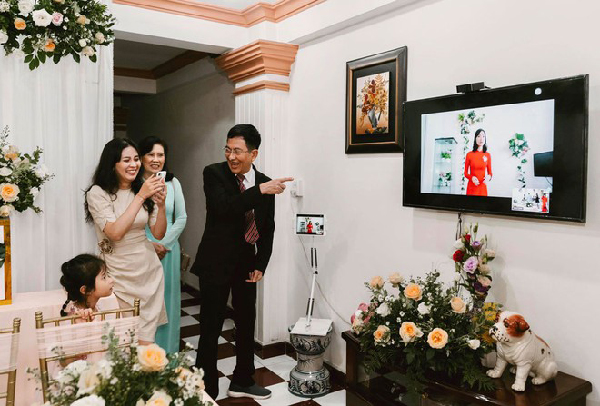 Ông Khoa cho biết: “Cái khó là đợt dịch lần 2 này, nhà trai lo lắng khó vào TP.HCM. Chúng tôi cũng đã coi ngày và vợ tôi bệnh nên khó dời lại. Tôi bàn bạc làm trực tuyến thì nhà trai quyết tâm vào. Họ mua đồ bảo hộ mặc, đi từ Hà Nội vào TP.HCM. Còn khoảng 15 phút nữa tới giờ đám hỏi và nhà trai chuẩn bị vào thì nhà tôi bị rớt mạng. Tôi rớt mồ hôi hột luôn, nhưng hên quá 2 phút sau sửa vừa kịp lúc là nhà trai bước vào”.