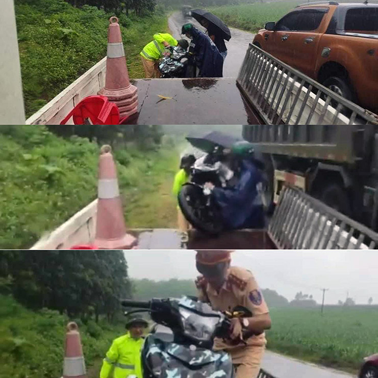 Sáng ngày 25/5/2021, trong thời tiết mưa to, Tổ công tác Đội CSGT - TT, Công an thị xã Thái Hoà đang làm nhiệm vụ tại km52+800 QL 48D địa phận xóm Phú Mỹ, xã Tây Hiếu phát hiện người dân đi xe máy bị áo khoác nắng quấn vào bánh sau xe, có thế gây tai nạn và không thể di chuyển, các Đoàn viên CSGT đã kịp thời hỗ trợ vận chuyển đến điểm sửa xe để đảm bảo an toàn....