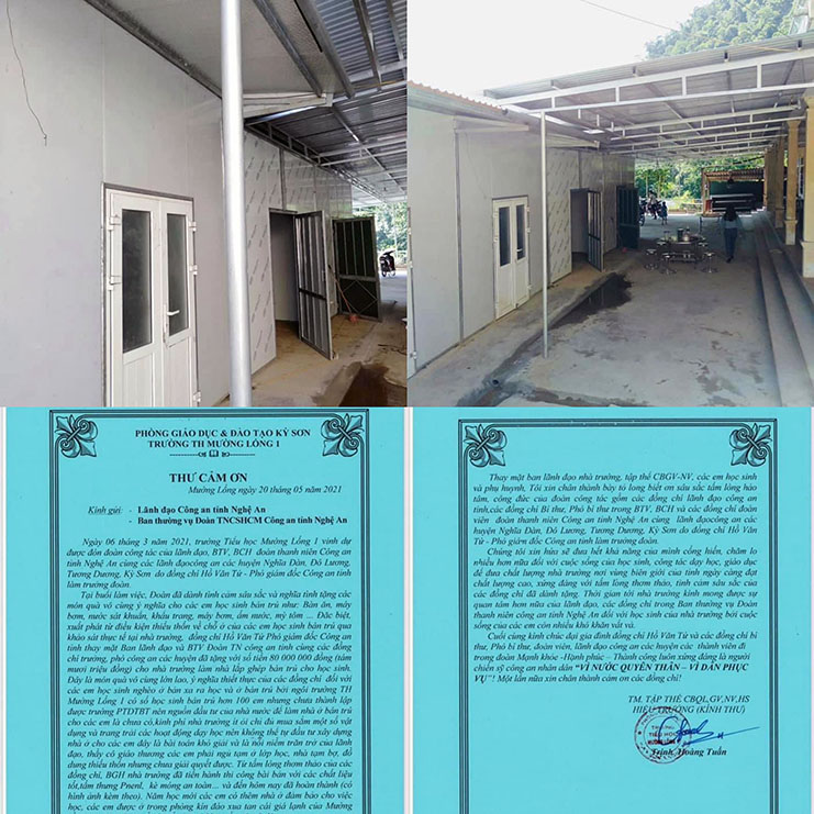 Đặc biệt, Công trình nhà bán trú cho các em học sinh tại trường tiểu học Mường Lống 1, xã Mường Lống, huyện Kỳ Sơn khởi công từ tháng 3/2021 do Đoàn Thanh niên Công an tỉnh, Công an huyện Kỳ Sơn và nhà trường hỗ trợ thi công đã hoàn thành. Công trình ý nghĩa để có thêm chỗ ăn, nghỉ cho các em học sinh miền núi rẻo cao vui bước tới trường.