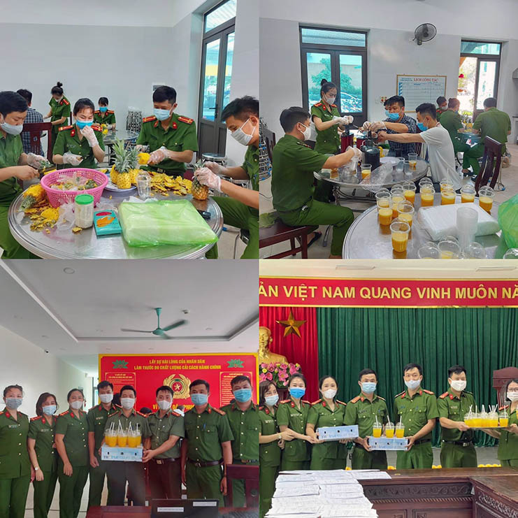 Đoàn viên thanh niên chi đoàn phòng cảnh sát QLHC về TTXH tổ chức làm nước ép hoa quả và chuẩn bị một số phần quà để tặng cho các tổ làm căn cước công dân tại bộ phận một cửa Công an tỉnh, đội tàng thư căn cước công dân và các tổ làm CCCD lưu động trên địa bàn thành phố Vinh và địa bàn huyện Diễn Châu.