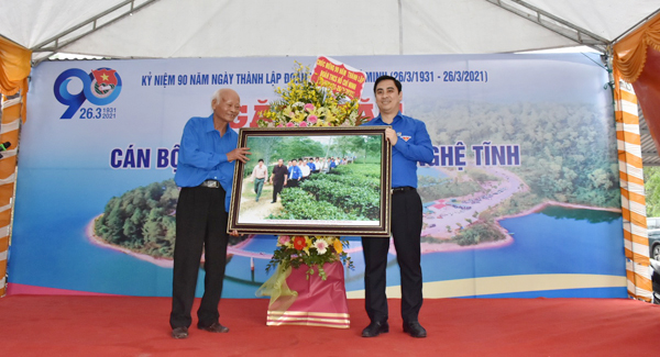 Đại diện cựu cán bộ Đoàn Nghệ Tĩnh tặng quà lưu niệm cho thế hệ trẻ Hà Tĩnh. |