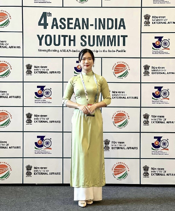 Đoàn đại biểu Việt Nam tham gia Hội nghị thanh niên ASEAN - Ấn Độ năm 2023. (Nguyễn Thị Hà Linh đứng hàng dưới, ngoài cùng bên phải) |