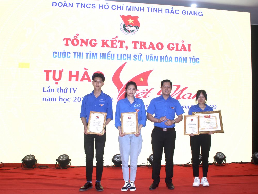 Nhân dịp này, Ban Thường vụ Tỉnh đoàn tổ chức Tổng kết, trao giải Cuộc thi Tìm hiểu lịch sử, văn hóa dân tộc “Tự hào Việt Nam” cho các thí sinh nhận giải. Đồng chí Giáp Xuân Cảnh, thừa ủy quyền của Trung ương Đoàn trao giải Khuyến khích cấp Trung ương cho thí sinh Lương Ngọc Linh trường THPT Tân Yên số 1 huyện Tân Yên.