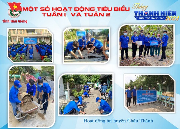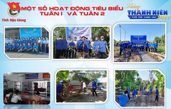 Theo đó, qua 02 tuần tổ chức triển khai Tháng Thanh niên, các cấp bộ Đoàn đã tổ chức tuyên truyền giáo dục về truyền thống vẻ vang của Đoàn TNCS Hồ Chí Minh, Tháng Thanh niên năm 2022 bằng nhiều hình thức phù hợp, sâu rộng trong toàn Đoàn với 977 cuộc, có hơn 50.340 lượt đoàn viên thanh niên tham gia; treo 228 băng rôn tuyên truyền. Tổ chức nhiều hoạt động phát huy tinh thần tình nguyện vì cộng đồng của thanh niên trong tham gia chung tay xây dựng nông thôn mới và đô thị văn minh; các hoạt động chăm lo thanh thiếu nhi và an sinh xã hội, tiêu biểu như: tiến hành thu gom 02 tấn rác thải, vớt lục bình khai thông dòng chảy với chiều dài 02km; phát quang, làm cỏ vệ sinh 23km đường nông thôn; xây mới và sửa chữa 02 cây cầu bê tông nông thôn; xây dựng 06 tuyến đường “Sáng – xanh - sạch đẹp - an toàn - an ninh trật tự”; thực hiện 01 “Con đường bích họa” với chiều dài 01km; thắp sáng 3,5km đường nông thôn; xây mới 09km đường bê tông, sửa chữa dặm vá 08km đường nông thôn; xây dựng 2km bờ kè sinh thái chống sạc lở; ra mắt 02 mô hình “Khu dân cư không có thanh niên mắc các tệ nạn xã hội”, 01 mô hình “Tuyến đường lắp camera an ninh” với chiều dài trên 01km; thực hiện 06 “Vườn ươm thanh niên”, ươm 14.000 cây xanh, trồng 88.300 cây xanh các loại; bàn giao 02 căn nhà tình thương; trao tặng 10 hệ thống lọc nước tinh khiết bằng năng lượng mặt trời; trồng và chăm sóc 495 bồn hoa các loại (Hành trình thứ 02 của lốp xe), thu gom hơn 656 ký giấy vụn; thăm và tặng hơn 1.135 phần quà, 65 suất học bổng; ra mắt 02 mô hình “Mẹ đỡ đầu” giúp 04 em mồ côi cha, mẹ do dịch bệnh Covid-19 và tai nạn giao thông; khám và cấp miễn phí 100 cơ số thuốc, hiến 265 đơn vị máu với tổng trị giá hơn 5,8 tỷ đồng.