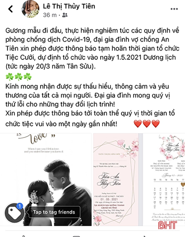 Phát huy tinh thần gương mẫu, xung kích của tuổi trẻ, ngày 29/4, chú rể Nguyễn Xuân Sáng và cô dâu Nguyễn Thị Thủy (TX Hồng Lĩnh - Hà Tĩnh) cũng đã quyết định hoãn sự kiện trọng đại của đời mình để cùng cộng đồng chống dịch.