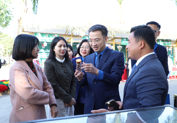 Bí thư Trung ương Đoàn Nguyễn Tường Lâm và các đại biểu thăm gian hàng khời nghiệp của thanh niên. |