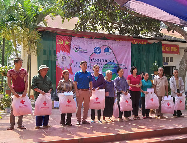 Lãnh đạo Hội LHTN Việt Nam tỉnh, Hội Chữ thập đỏ tỉnh tặng quà cho các hộ gia đình có hoàn cảnh khó khăn. |