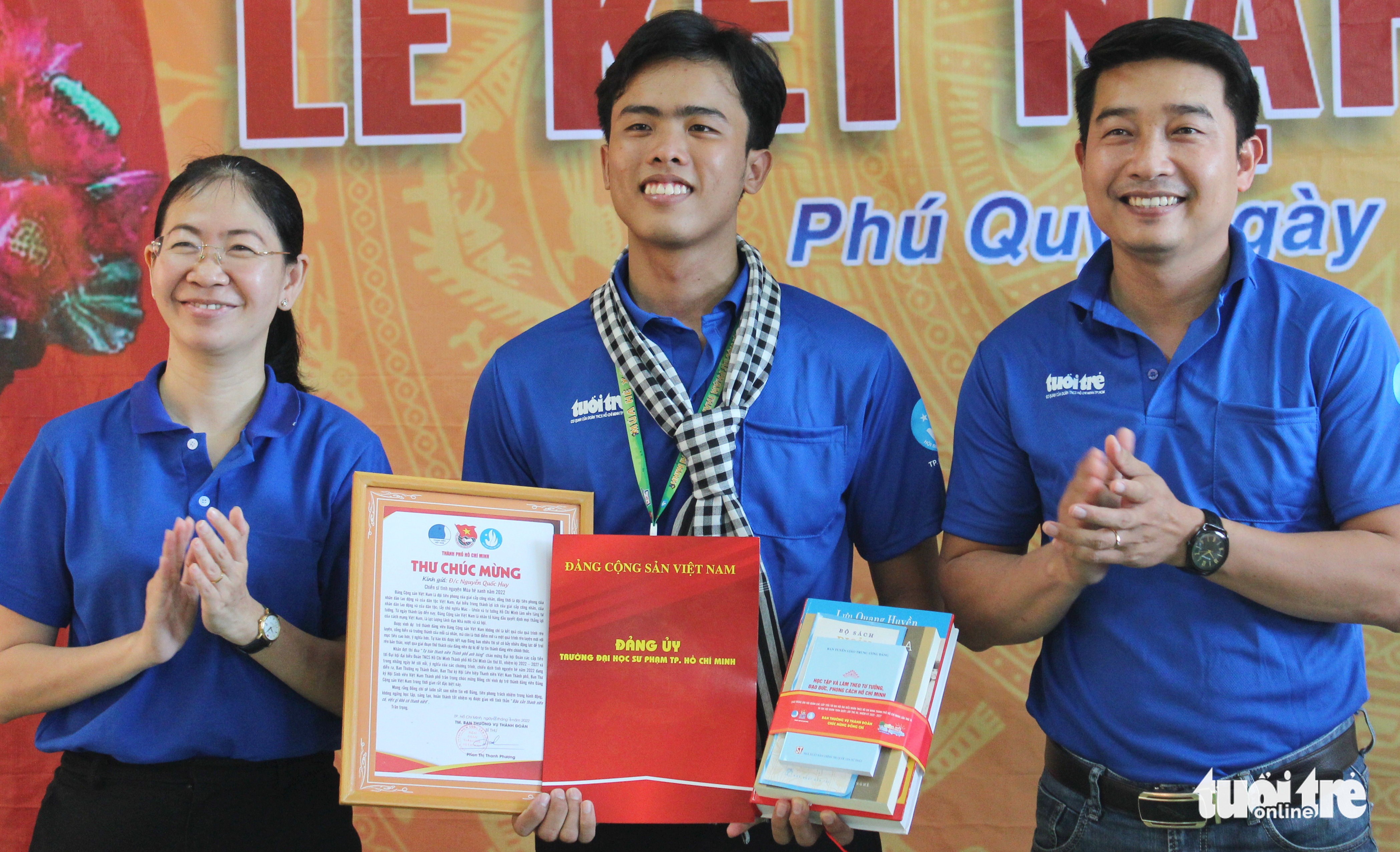 Bí thư Thành đoàn TP.HCM Phan Thị Thanh Phương trao học bổng cho học sinh tại đảo Phú Quý (Bình Thuận).