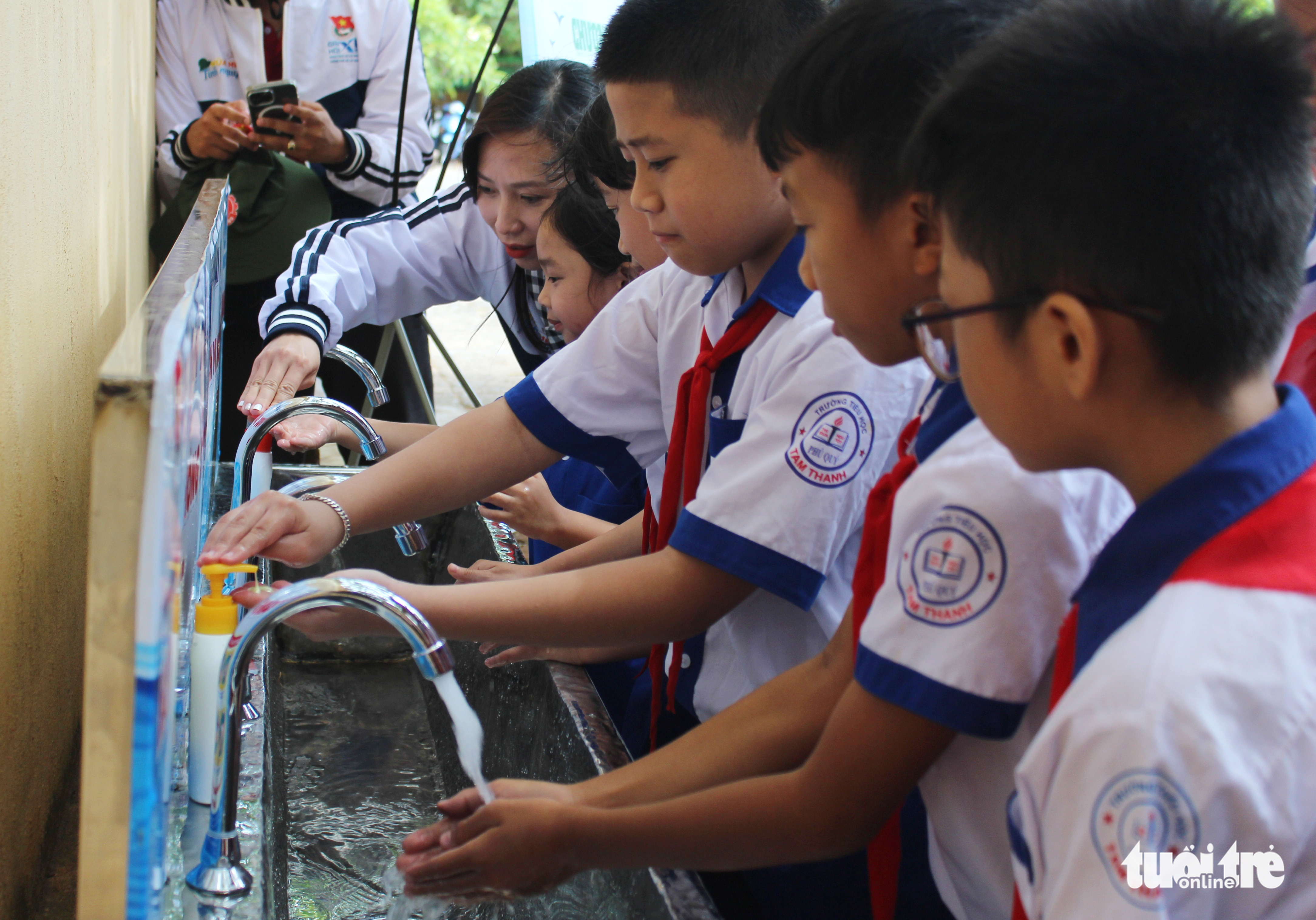 Ngay cạnh đó, hệ thống bồn rửa tay với cần đạp chân cũng được các chiến sĩ Kỳ nghỉ hồng hoàn thành để tặng học sinh, giúp các em giữ vệ sinh, phòng tránh dịch bệnh.