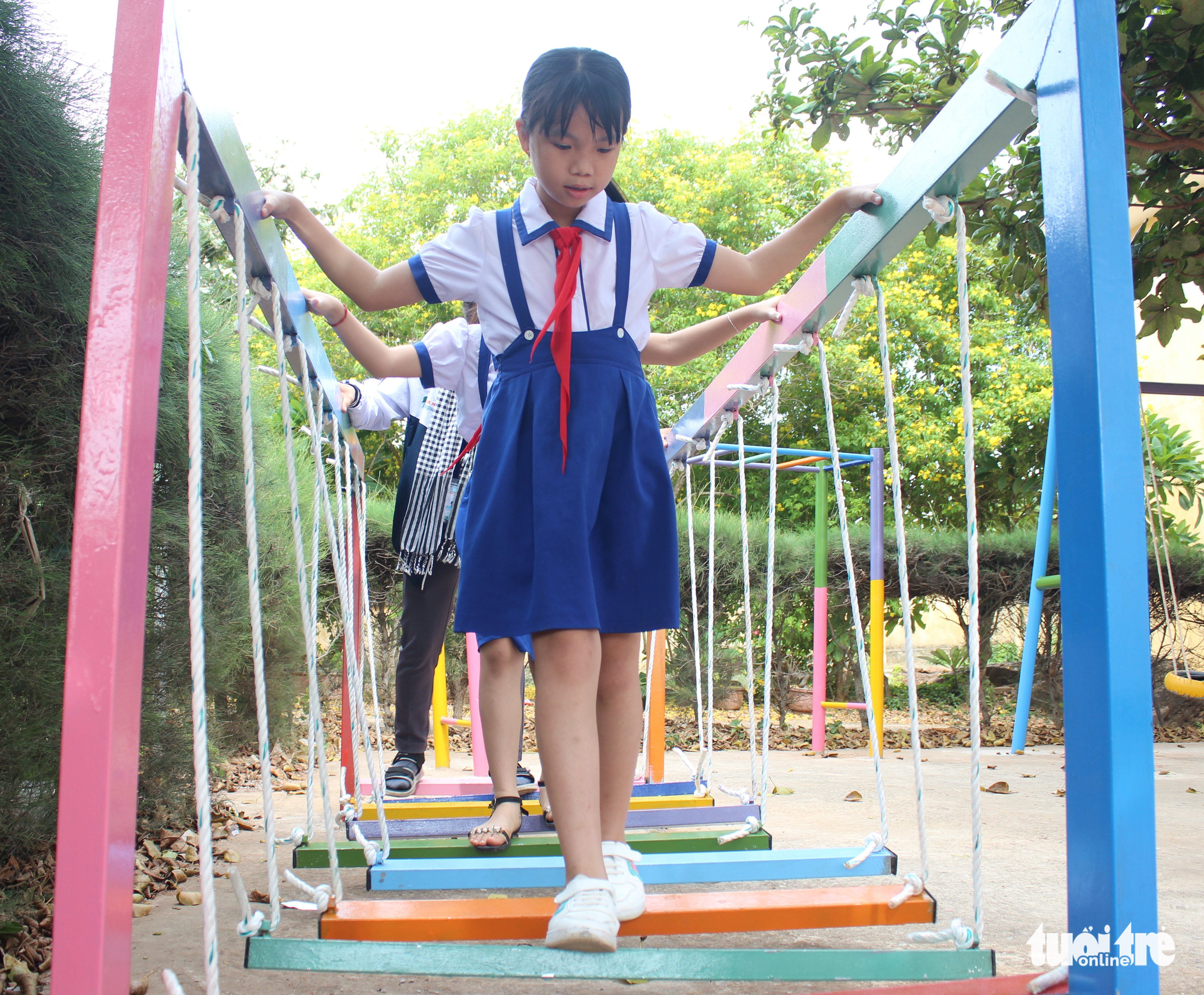 Các chiến sĩ tận dụng một khoảng sân trống bên cạnh dãy lớp học và biến thành khu vườn trường với một số thiết bị trò chơi từ khung thép và vật liệu tái chế. Ở đó, các bạn còn làm một sân chơi với thiết kế hình chữ S để giáo dục học sinh về chủ quyền đất nước.