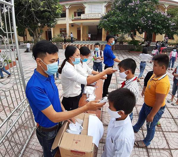 Đội phản ứng nhanh Huyện đoàn Nghi Lộc, Thanh Chương hỗ trợ đo thân nhiệt, rửa tay sát khuẩn, phát khẩu trang cho học sinh. |