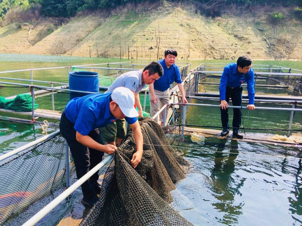 Đội trí thức trẻ tình nguyện chuyển giao KH-KT lĩnh vực nông nghiệp tỉnh Nghệ An đến thăm, hướng dẫn kỹ thuật thu hoạch, bảo quản sản phẩm cá lồng lòng hồ thuỷ điện Hủa Na tại Hợp tác xã Nông nghiệp & Dịch vụ Hủa Na, xã Đồng Văn, huyện Quế Phong
