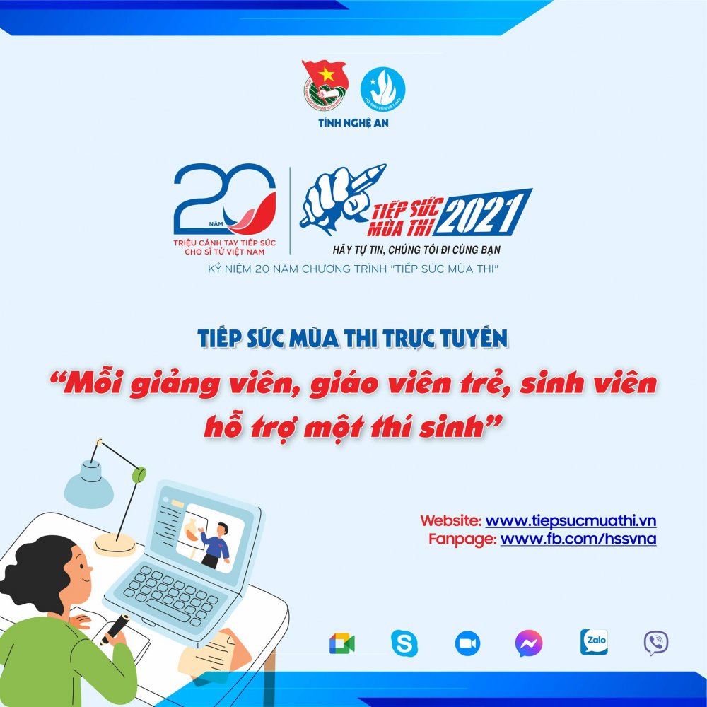 Nhằm đảm bảo phòng chống dịch bệnh Covid-19, tận dụng công nghệ thông tin vào cuộc sống, Tỉnh đoàn & Hội Sinh viên tỉnh Nghệ An tiếp tục triển khai mô hình Tiếp sức mùa thi trực tuyến "Mỗi giảng viên, giáo viên trẻ, sinh viên hỗ trợ một thí sinh" bên cạnh các hoạt động thường niên trước đây.