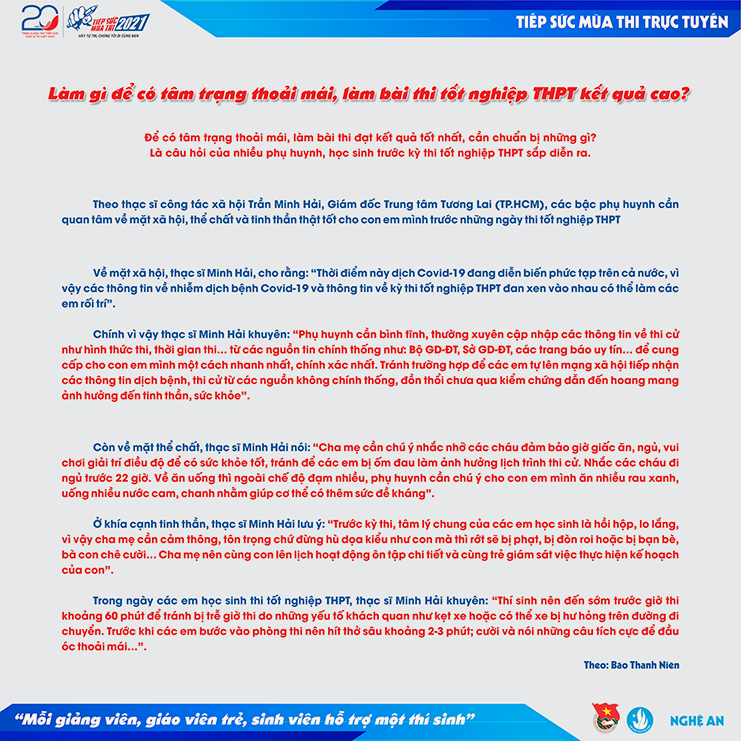 Bên cạnh đó, Tỉnh đoàn và Hội Sinh viên tỉnh tích cực tuyên truyền, giới thiệu cho phụ huynh, học sinh biết về các kênh hỗ trợ thí sinh trong kỳ thi như cổng thông tin Tiếp sức mùa thi tại Website: www.tiepsucmuathi.vn, fanpage: Tiếp sức mùa thi Nghệ An, Website: HOCMAI.VN để tiếp cận thông tin kỳ thi, kết nối tình nguyện viên, tham gia khóa ôn luyện kiến thức uy tín, tiếp cận các nội dung hỗ trợ tâm lý, dinh dưỡng mùa thi, bí quyết ôn thi đạt điểm cao...