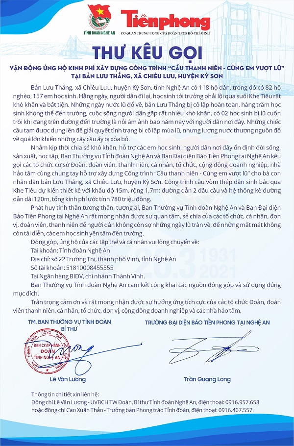 Thư kêu gọi ủng hộ kinh phí xây dựng công trình "Cầu thanh niên - cùng em vượt lũ" tại bản Lưu Thắng, xã Chiêu Lưu, huyện Kỳ Sơn của Ban Thường vụ Tỉnh đoàn và Ban Đại diện Báo Tiền phong tại Nghệ An