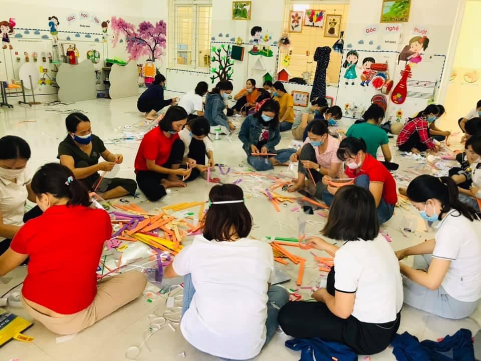 Chỉ trong ngày 7/5, các cô giáo tại Chi đoàn Trường Mầm non Quỳnh Dị cùng nhân dân địa phương “sản xuất” hơn 1000 tấm kính chắn giống giọt bắn.