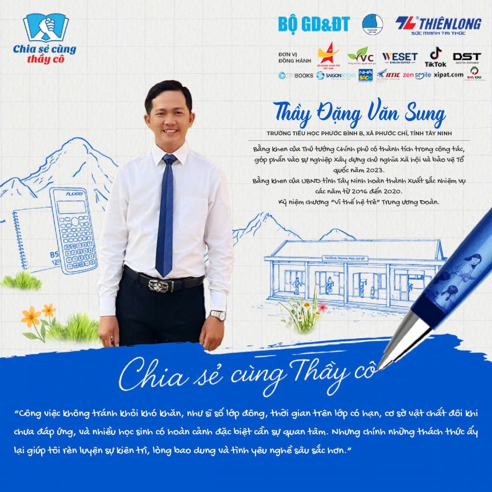 Đặc biệt, năm 2025, là dấu mốc đáng nhớ trong hành trình cống hiến của thầy giáo trẻ vùng biên giới khi thầy Đặng Văn Sung được vinh danh trong chương trình “Chia sẻ cùng thầy cô” do Trung ương Hội Liên hiệp Thanh niên Việt Nam, Bộ Giáo dục và Đào tạo, cùng Tập đoàn Thiên Long phối hợp tổ chức. Đây là chương trình mang ý nghĩa nhân văn sâu sắc nhằm tri ân, tôn vinh những thầy cô giáo tiêu biểu đang ngày đêm gieo chữ nơi vùng khó khăn, biên giới, hải đảo. Được chọn là gương mặt đại diện cho đội ngũ giáo viên Tây Ninh tham dự chương trình, thầy Sung không chỉ mang đến niềm tự hào cho ngôi trường Phước Bình B, mà còn là niềm tự hào của ngành giáo dục tỉnh nhà.