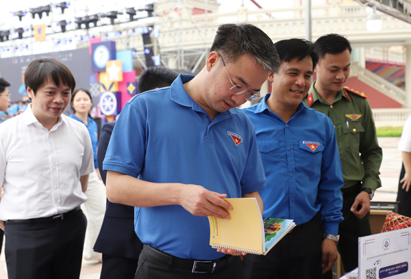 Anh Nguyễn Tường Lâm thăm quan các gian hàng trưng bày sản phẩm của Thanh niên khuyết tật. |