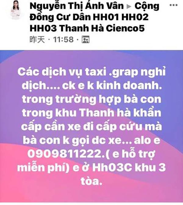 Anh Chiến biết rằng, dù dịch bệnh thì việc bị ốm đau vẫn chẳng chừa một ai. Vì thế vợ anh đã đăng lên group cộng đồng cư dân HH01, HH02, HH03 Thanh Hà Cienco5 thông báo, chồng mình sẽ tình nguyện miễn phí giúp mọi người nếu cần hỗ trợ đi cấp cứu.
