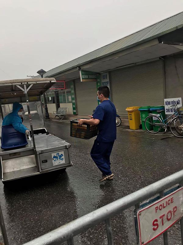 Nguyễn Anh Tuấn tặng hoa tươi, bánh bao và cam cho các bác sĩ Bệnh viện Bệnh Nhiệt đới Trung ương. |