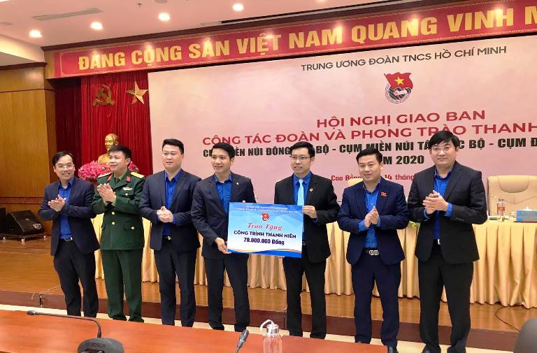 Anh Nguyễn Ngọc Lương, Bí thư Trung ương Đoàn, Chủ tịch Hội đồng Đội Trung ương cùng các đồng chí lãnh đạo trao tặng kinh phí xây dựng công trình thanh niên trị giá 70 triệu đồng cho tỉnh đoàn Cao Bằng