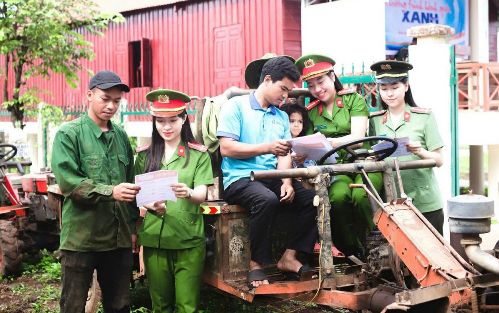 Thượng úy Hồ Ngọc Thiên Thư cùng đồng nghiệp tham gia tuyên truyền pháp luật trong chương trình "Hành quân xanh tại Buôn Dhă Prong, phường Buôn Ma Thuột |