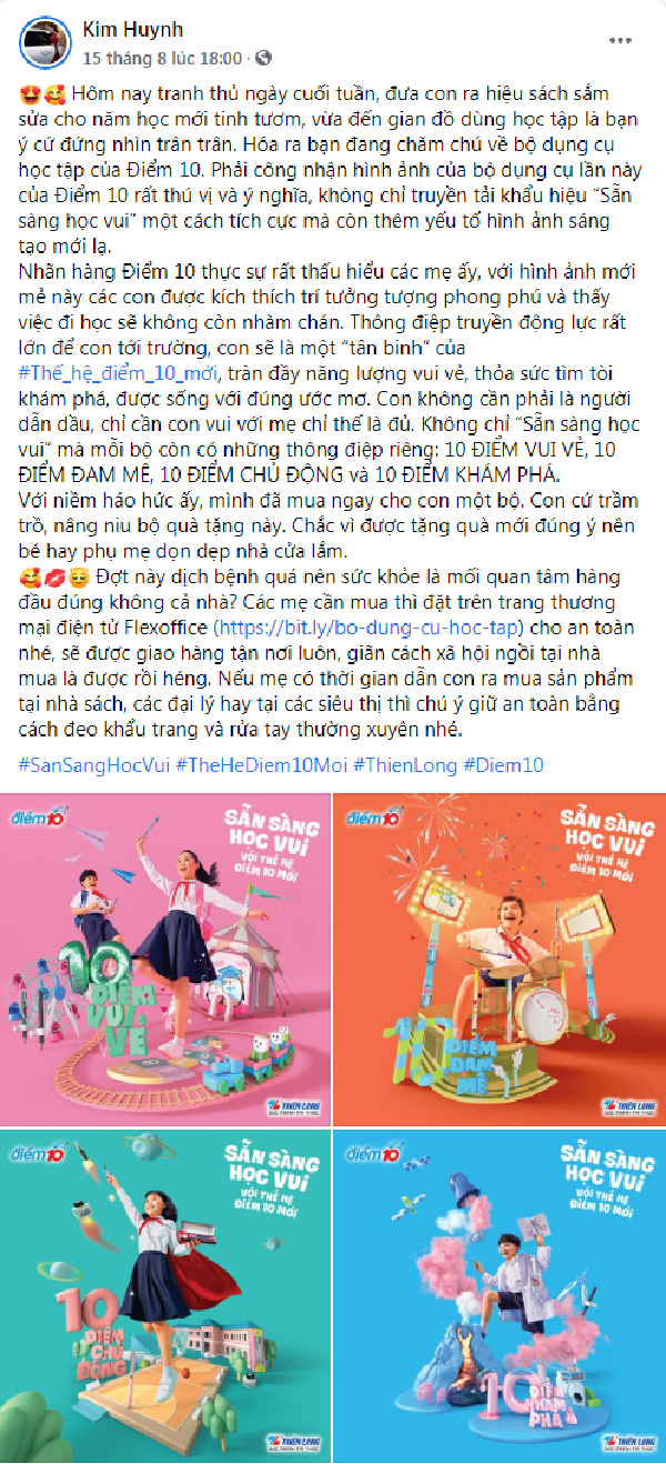 Mẹ có tài khoản Facebook Kim Huynh chia sẻ: "Thông điệp truyền động lực rất lớn để con tới trường, con sẽ là một "tân binh" tràn đầy năng lượng vui vẻ, thỏa sức tìm tòi khám phá, được sống với đúng ước mơ. Con không cần phải là người dẫn đầu, chỉ cần vui với mẹ chỉ thế là đủ". Bên cạnh chia sẻ về bộ tranh, chị cũng không không ngần ngại, mua ngay bộ dụng cụ học tập Điểm 10 cho con vui bước đến trường khám phá những điều thú vị.