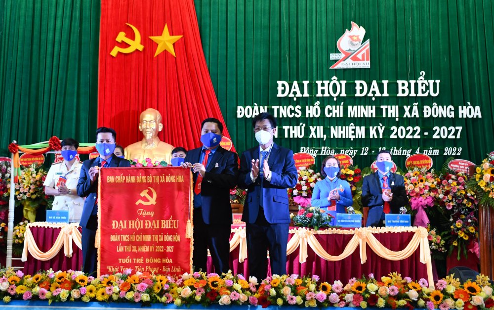 Tỉnh ủy viên, Bí thư Thị ủy Đông Hòa Trần Văn Tân trao tặng bức trướng của Ban Chấp hành Đảng bộ thị xã Đông Hòa cho Đại hội mang dòng chữ “Tuổi trẻ Đông Hòa - Khát vọng - Tiên phong- Bản lĩnh- Đoàn kết- Sáng tạo- Phát triển”. |