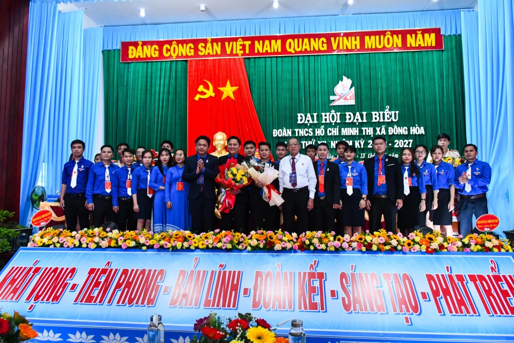 Thường trực Tỉnh Đoàn và Thường trực Thị ủy Đông Hòa tặng hoa chúc mừng Ban Chấp hành Thị Đoàn Đông Hòa khóa XII, nhiệm kỳ 2022 - 2027. |